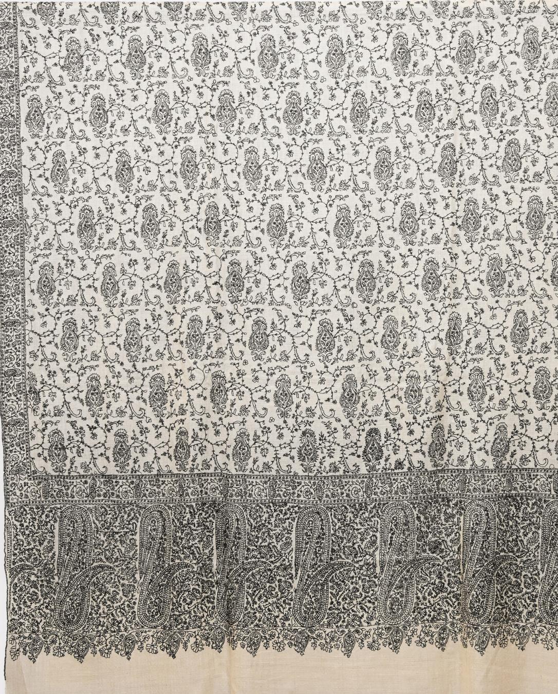 Crafted from Pure Pashmina, this luxurious men’s shawl embodies the essence of Kashmiri heritage through its refined Sozni Hand Embroidery. Showcasing a seamless blend of Paisley and Floral Motifs, the design features rich black threadwork embroidered delicately over an elegant Ivory Cream Base. The prominent Paisley Patterns along the wide border are balanced beautifully by a field of intricate floral vines, reflecting traditional craftsmanship and masculine sophistication. Hand embroidered with remarkable precision, this shawl not only offers warmth and comfort but also timeless elegance. Ideal for formal wear, winter gatherings, or cultural occasions, it is a perfect heirloom-quality piece for the modern man who values authenticity and luxury.